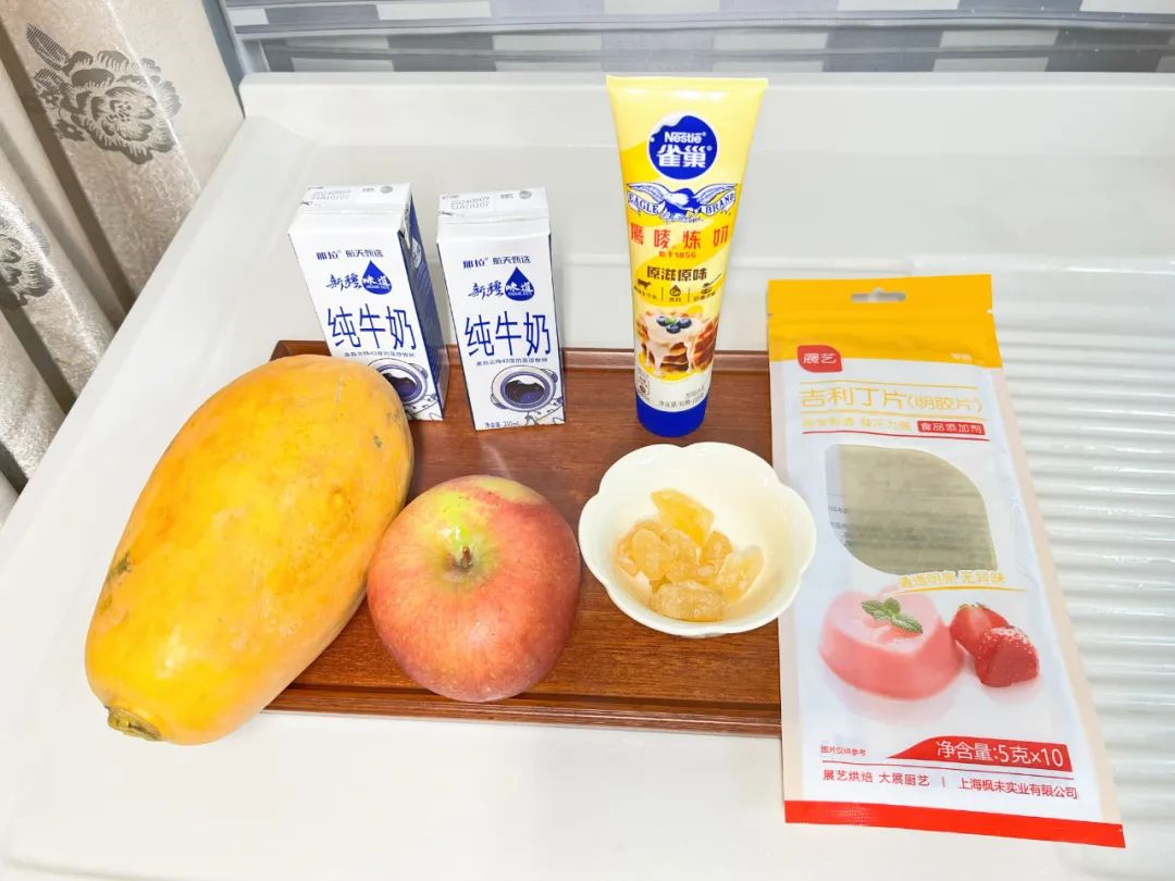 配料:木瓜、牛奶、冰糖、炼乳、吉利丁片