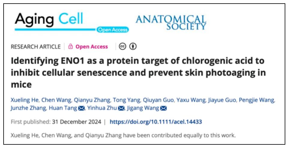 ①Identifying ENO1 as a protein target of chlorogenic acid to inhibit cellular senescence and prevent skin photoaging in mice.Aging Cell.First published: 31 December 2024
