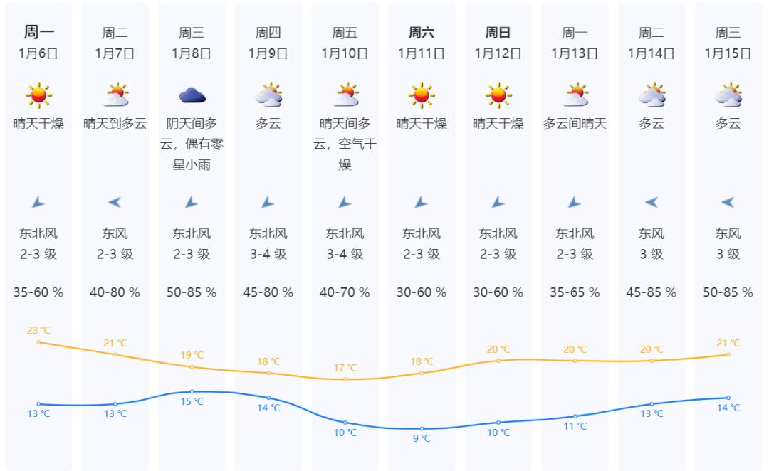 一月六日,晴天,空气干燥,气温13℃-23℃。;东北风2-3级;相对湿度35-60 %。