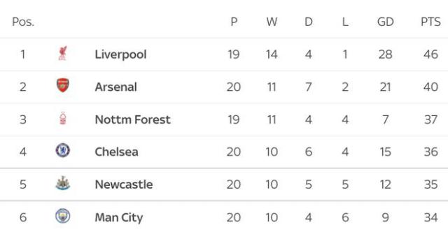 在第 20 轮子,排在积分榜之前 4 失去了利物浦、阿森纳和切尔西。 2 分数,诺丁汉森林排名第三,周一出场,排名第一。 5、第 6 与前四名球队相比,纽卡斯尔和曼城的差距缩小了,排名第一。 4 切尔西各自都少了 1 分、2 分。