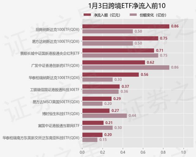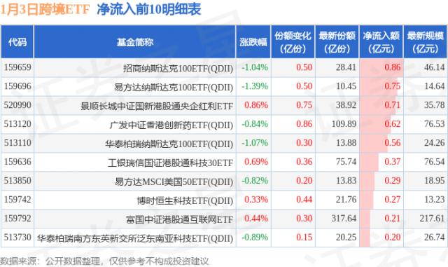 证券之星消息,1 月 3 日跨境 ETF 总资金净流入基金 1.06 亿元,近 5 一个交易日累计净流入 23.79 亿元,5 在一个交易日内,出现了日合计资金净流入。 4 天(ETF 计算资金流入的方法:(当日 ETF 现场流通份额 - 前一交易日 ETF 现场流通份额)* 当天 ETF 均价,数字仅供参考)。