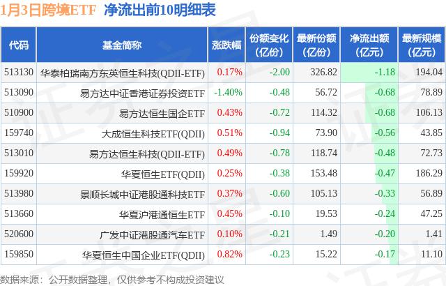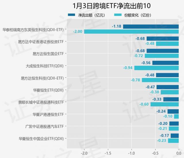 当天有 31 只跨境 ETF 资金净流出,其中华泰柏瑞南方东英恒生科技排名第一。 ( QDII-ETF ) (513130),份额下降 2.0 一亿份,净流出额为 1.18 亿元。