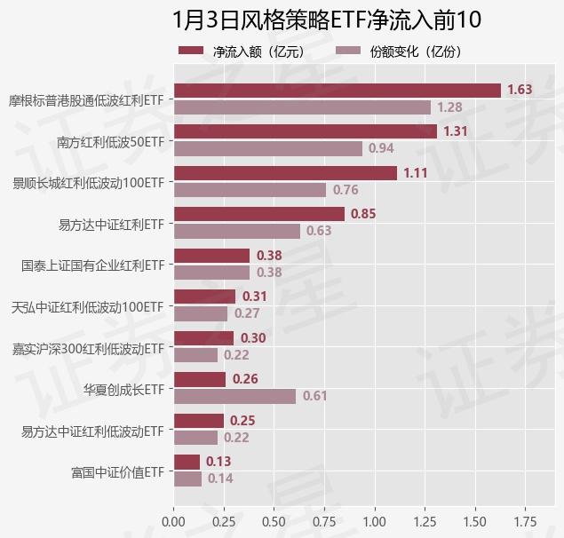 证券之星消息,1 月 3 日风格策略 ETF 总资金净流入基金 3.87 亿元,近 5 一个交易日累计净流入 48.63 亿元,5 在一个交易日内,出现了日合计资金净流入。 5 天(ETF 计算资金流入的方法:(当日 ETF 现场流通份额 - 前一交易日 ETF 现场流通份额)* 当天 ETF 均价,数字仅供参考)。