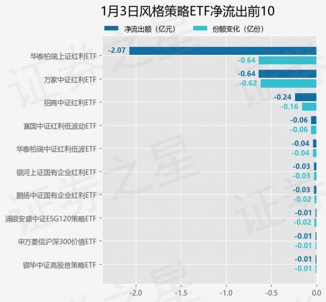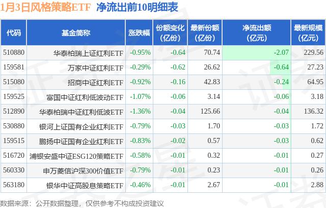 当天有 11 只风格策略 ETF 资金净流出,其中华泰柏瑞上证红利排名第一。 ETF(510880),份额下降 6350.0 万份,净流出额为 2.07 亿元。