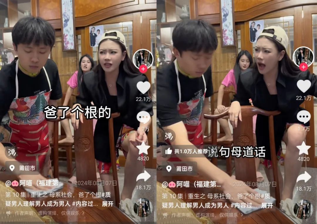 或许是看到了观众的这些“隐形需求”,@阿喵(福建第一内向)从此完全走上了讽刺男人的路线。半年多的时间里,我们创作了数百个视频,还发布了“如果我们回到母系社会”等一系列内容。
