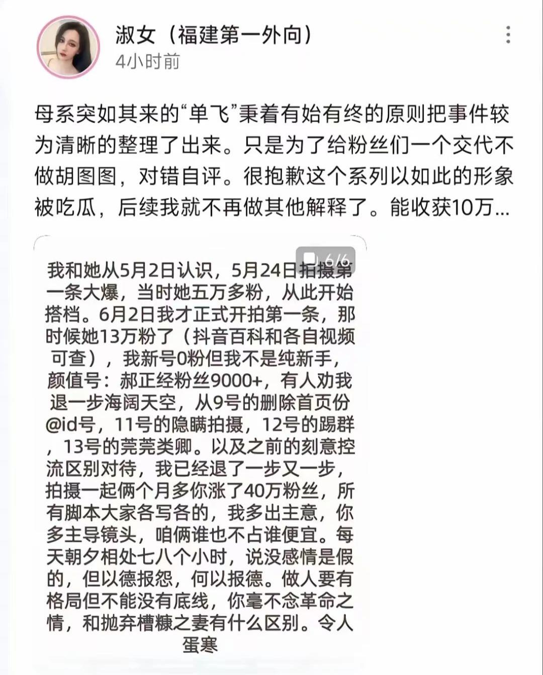然而,美好的时光并没有持续多久。随着视频流量的逐渐增加,@阿喵(福建第一内向)与另一位女性合拍博主@淑女(福建第一外向)有差距。@阿喵(福建第一内向)首先在个人介绍中删除了所有其他合拍演员的账号,只留下了自己的小号介绍。