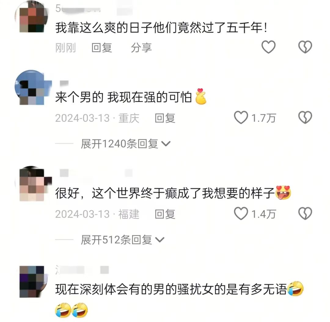 这样的视频引起了很多网友的热议。有人评论说“现在给我一个男人,我很坚强”,也有人看透了视频的讽刺,说“现实生活中男生真的很讨厌,但是没有办法”。在@阿喵(福建第一内向)的视频中,有一种“敢怒敢言”的快感。