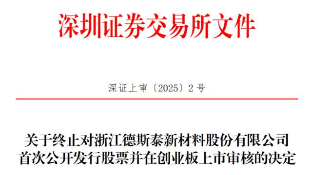 瑞财经 王敏 1 月 3 日,深交所发布决定,停止对浙江德斯泰新材料有限公司(以下简称“德斯泰”)首次公开发行股票并在创业板上市审批。