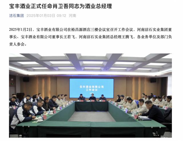 瑞财经 刘治颖 1 月 3 日,据洁石集团官方消息,2025 年 1 月 2 日,宝丰酒业有限公司召开工作会议。会上,河南洁石实业集团总经理王腾飞宣布,自即日起,特聘肖卫吾同志担任宝丰酒业有限公司总经理,全面负责宝丰酒业的经营管理。