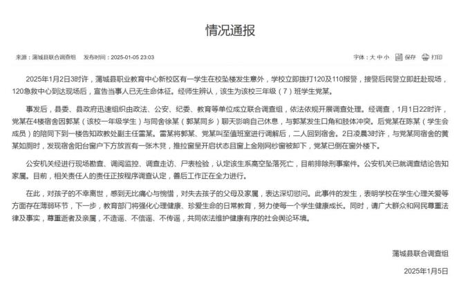 一月五日深夜,陕西省蒲城县联合调查组发布了一份关于“一名学生在学校坠楼事故”的报告,报告如下: