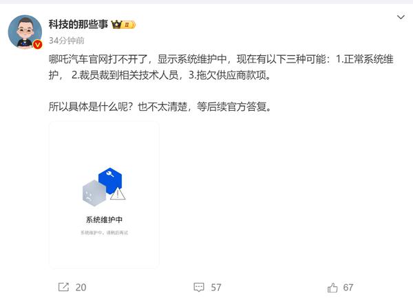 【CNMO 科技消息】1 月 6 日,CNMO 注意哪吒汽车官网打不开,页面提示正在进行系统维护。针对这一现象,一些博主提出了三个概率:一是正常的系统维护流程,二是裁员到相关技术人员,三是供应商欠款问题。为了准确的原因,我们需要等待哪吒的官方回复。