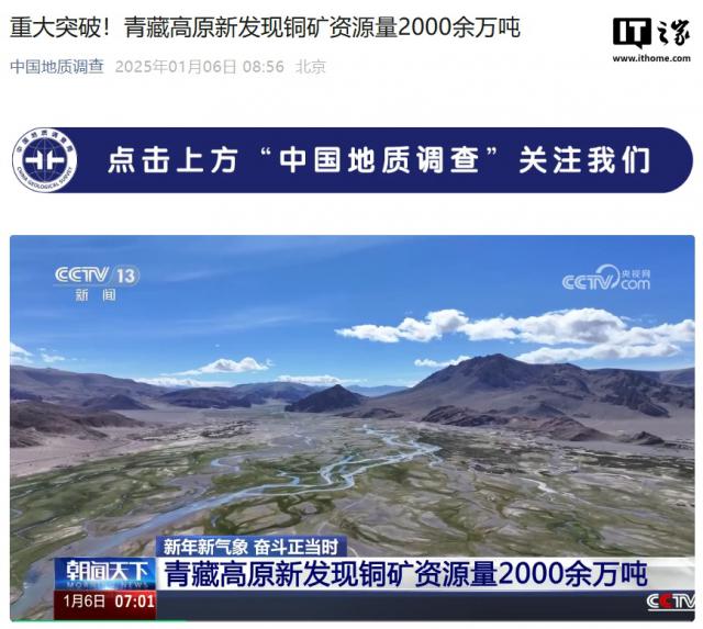 IT 世家 1 月 6 据央视新闻今日报道,从自然资源部中国地质调查局获悉,我们国家在青藏高原找矿取得了重大进展,新发现铜矿资源 2000 余万吨。