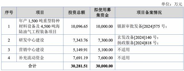 这次长江能科公开发行的股票数量不超过 3000 万股,拟募集资金为 3 亿元,其中 1 年产1亿元 1500 吨重特种材料设备及 4500 吨级海陆油气工程设备项目,7300 研发中心建设万元,5100元。 营销中心建设万元,7600元。 一万元用于补充营运资金。根据计算,42% 募集资金用于营销,补流。