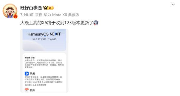【CNMO 近日,华为科技新闻 Mate 70 系列与 Pura 70 系列已启动 HarmonyOS NEXT 5.0.0.123 推送版本。现在,华为 Mate X6 还加入了这个更新团队,实现了数据包容量 2.48GB。