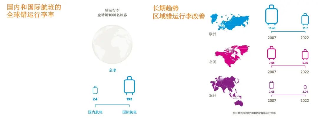 根据 SITA(国际航空电信集团)报告数据,2022 2000年,全球国际航班行李错误处理率为每年。 1000 名乘客 19.3 一件行李,如果按区域规划,北美每个人 1000 名乘客含有 6.35 一件行李处理不当,而欧洲则是 15.7 件。