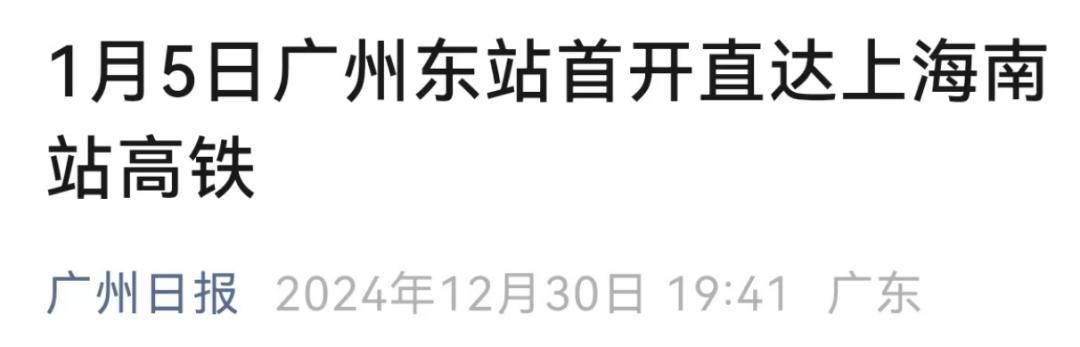 根据广州日报的报道,从2025年1月5日0点开始,全国铁路开通了新的列车运行图。广铁集团增加了29对乘客列车,提高了运输能力布局。其中,广州东站第一次直接开行上海南站G1306次高速铁路,只需7小时40分钟即可直达。