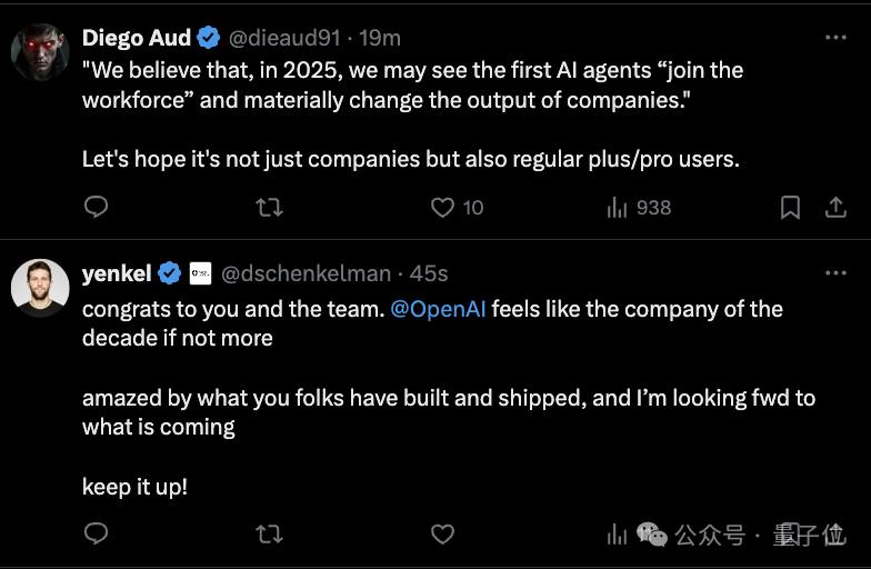 还有对新年的展望:2025年,首批AI Agent将加入劳动力大军;并且延长了时间维度,他们的目标已经转变为真正的超级智能。
