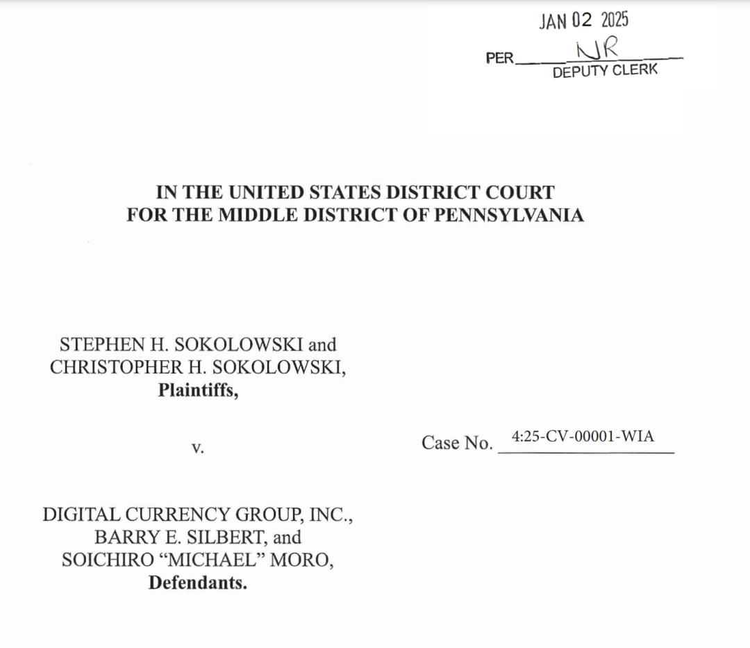 这个诉讼案名叫Sokolowski等诉Digitalal Currency Group等,指控被告Barry E. 前Genesisisisilbert和 Global TradingCEOMichael Stephenmoro欺诈 Sokolowski和Christopher Sokolowski。