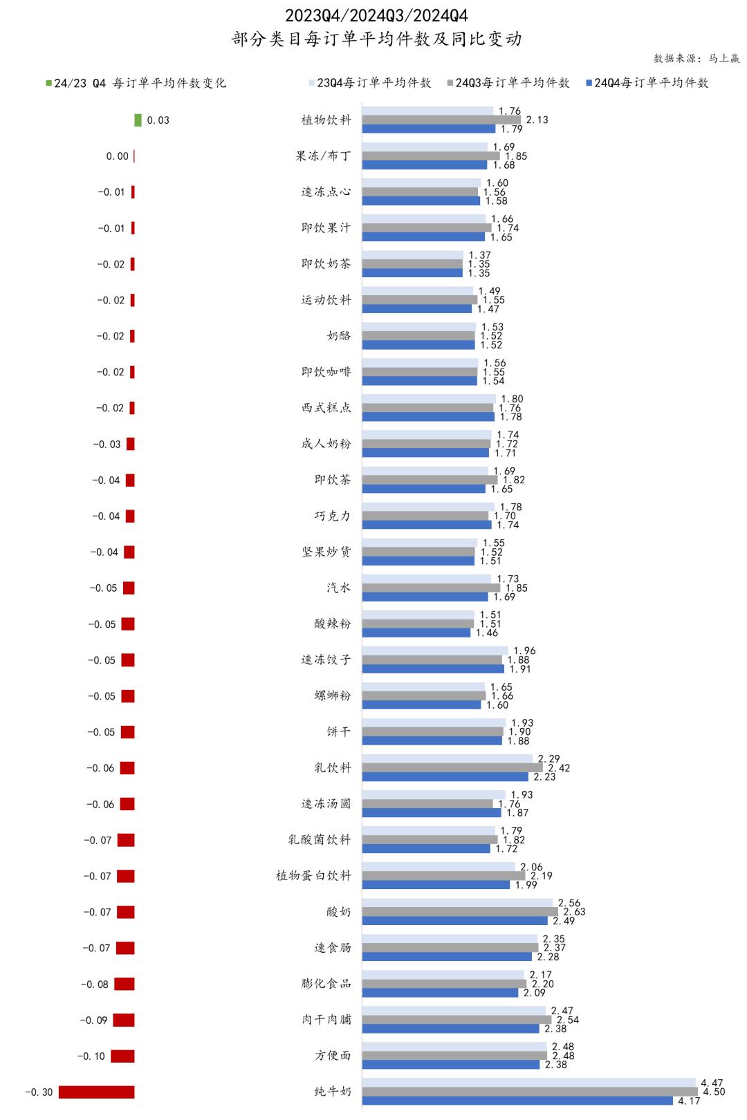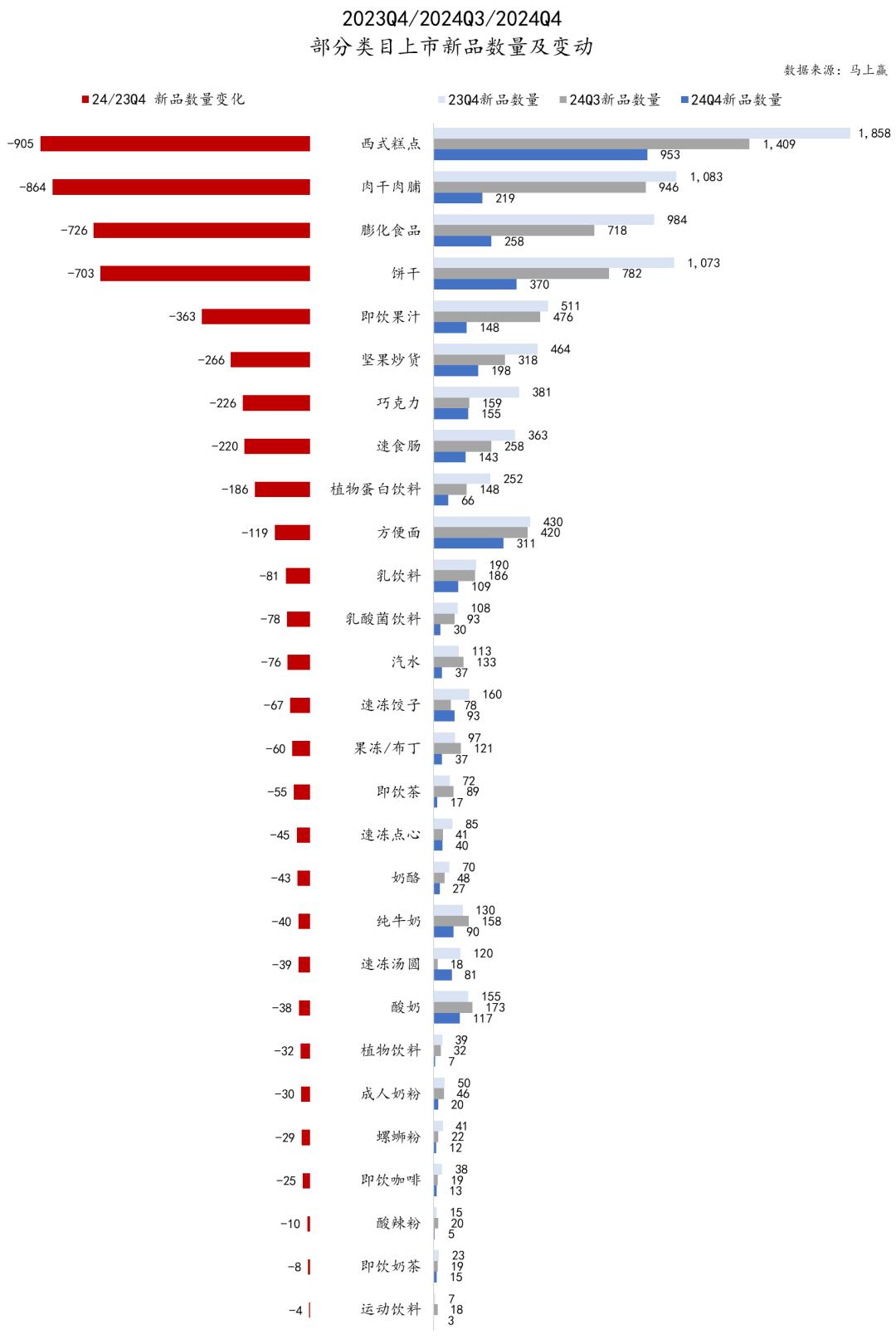 首先,我们可以看到上市数量的同比变化。与23Q4相比,24Q4在所有品类上市的新产品数量都有明显的下降,甚至今年流行的植物饮料品类也从一个方面反映了当下的消费背景,人们对保守的偏好和创新的谨慎。