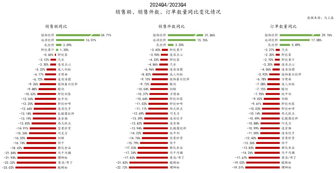 从整体销量、销量、订单数量来看,只有部分饮料类别在三个指标中有所增长,所有选择的食品类别和三个指标都呈现同比下降趋势。具体来说,在饮料类别中,植物饮料的快速增长不用说,运动饮料的增长也比较强劲。牛奶饮料受年度事件影响,仍呈现同比增长趋势。值得注意的是,即饮茶这一类,今年首次出现同比增速为负的情况,并呈现同比增速。<订货量同比增长<销量同比增长,意味着消费者的选择意愿和价格都在放缓。值得2025年特别关注。作为近两年明星增长的一个品类,也就是喝茶的“振动”,对于今天快速增长的品类中的参与者来说,这是一个警钟和提示。