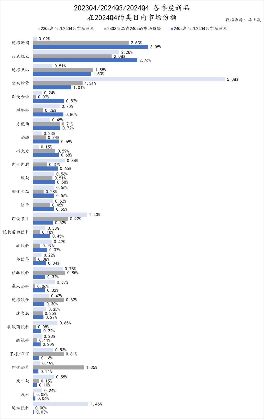 在整体压力下,除了上市的新产品数量之外,新品类的生存和增长能力也成为品类是否存在新增长机会和动力的重要标尺。我们将2023年Q4、2024Q3和2024Q4三个季度上市的新产品在2024Q4的市场份额情况下进行了梳理,以观察过去各类上市新产品的生存能力,以及近两个季度上市新产品的增长动能。