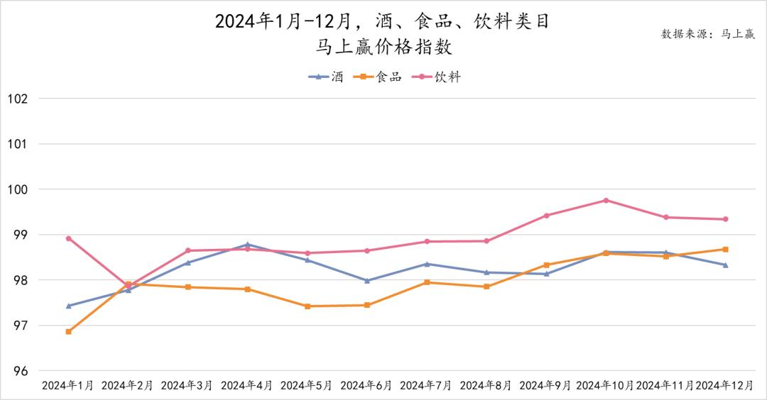 食品、饮料、酒类等价格指数的变化可以看出,2024年10月至2024年12月是2024Q4,一方面,三大类的价格指数均处于全年高位;另一方面,下半年食品、饮料等品类的价格指数有一定的上涨趋势。虽然各种品类的价格指数仍然不到100的基准线,但已经可以看到复苏的迹象。