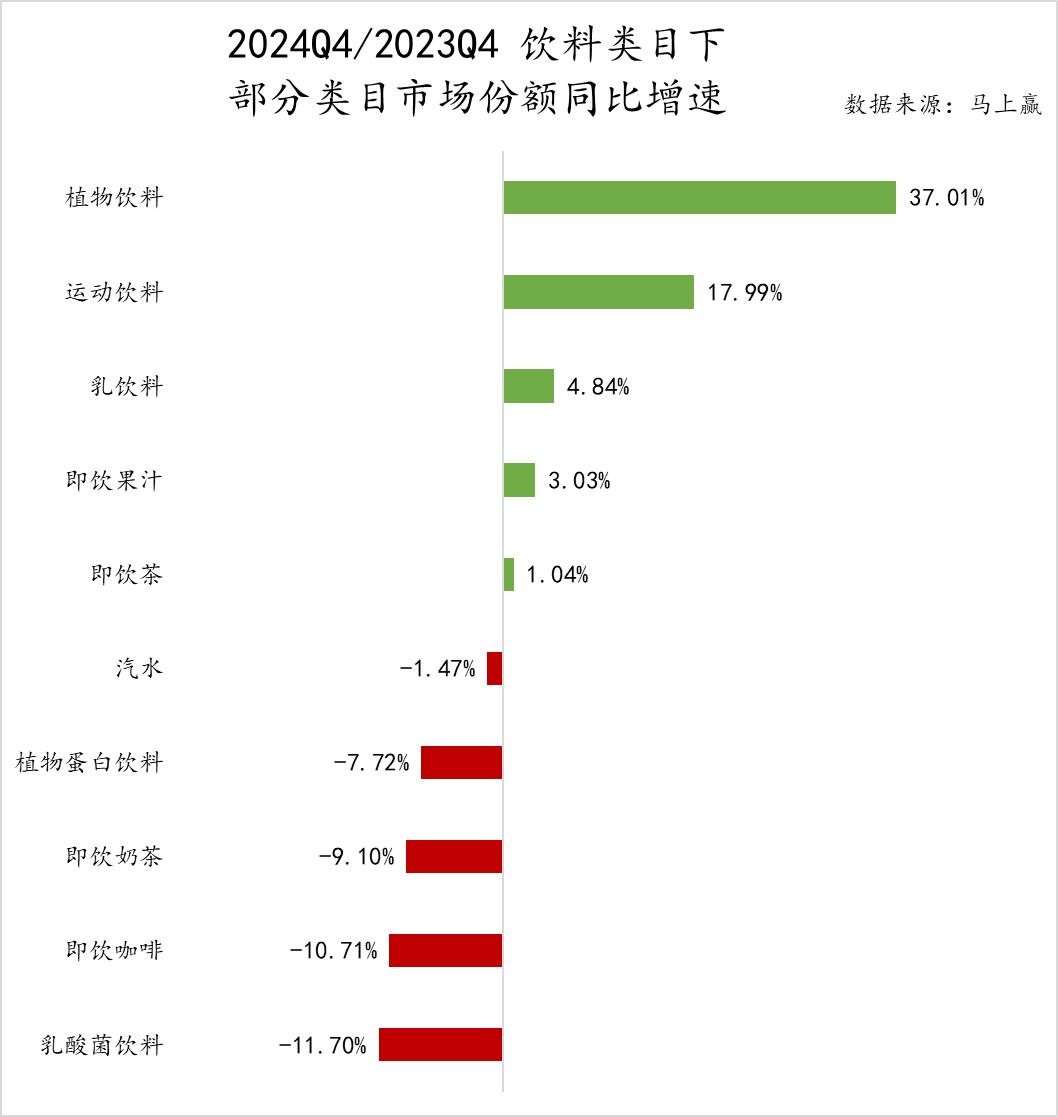 特别值得注意的是,即饮茶作为2023年至2024年最热门的饮料品类,同比增速正在迅速放缓。一方面与2023年Q4开始增长的高基数有关;另一方面,即饮茶中的低糖即饮茶,“东方叶”的主导地位和参与者众多,客观上加快了品类的生长过程,现在面临的是过度的内卷。从低糖即饮茶到植物饮料,从格局来看,植物饮料的整体规模还是比较小的,还没有出现主导现象,增长势头可能会持续更长时间。