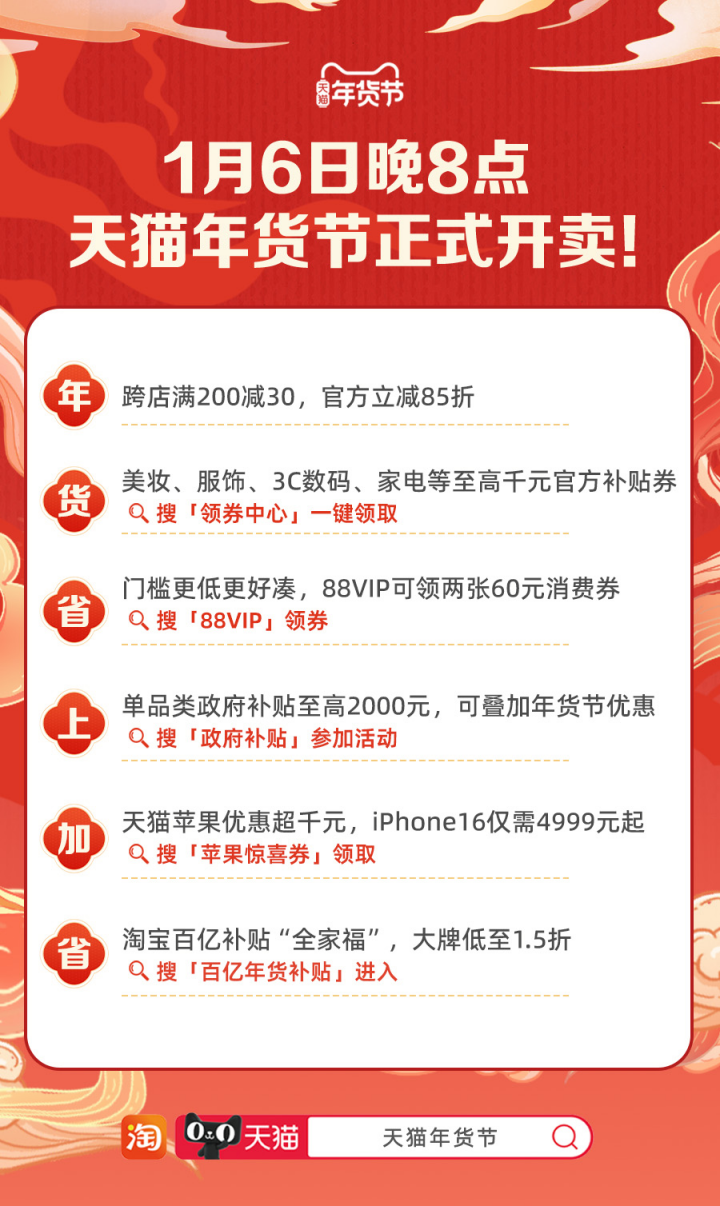 今晚8点,天猫年货节开始销售,单品类补贴无上2000元
