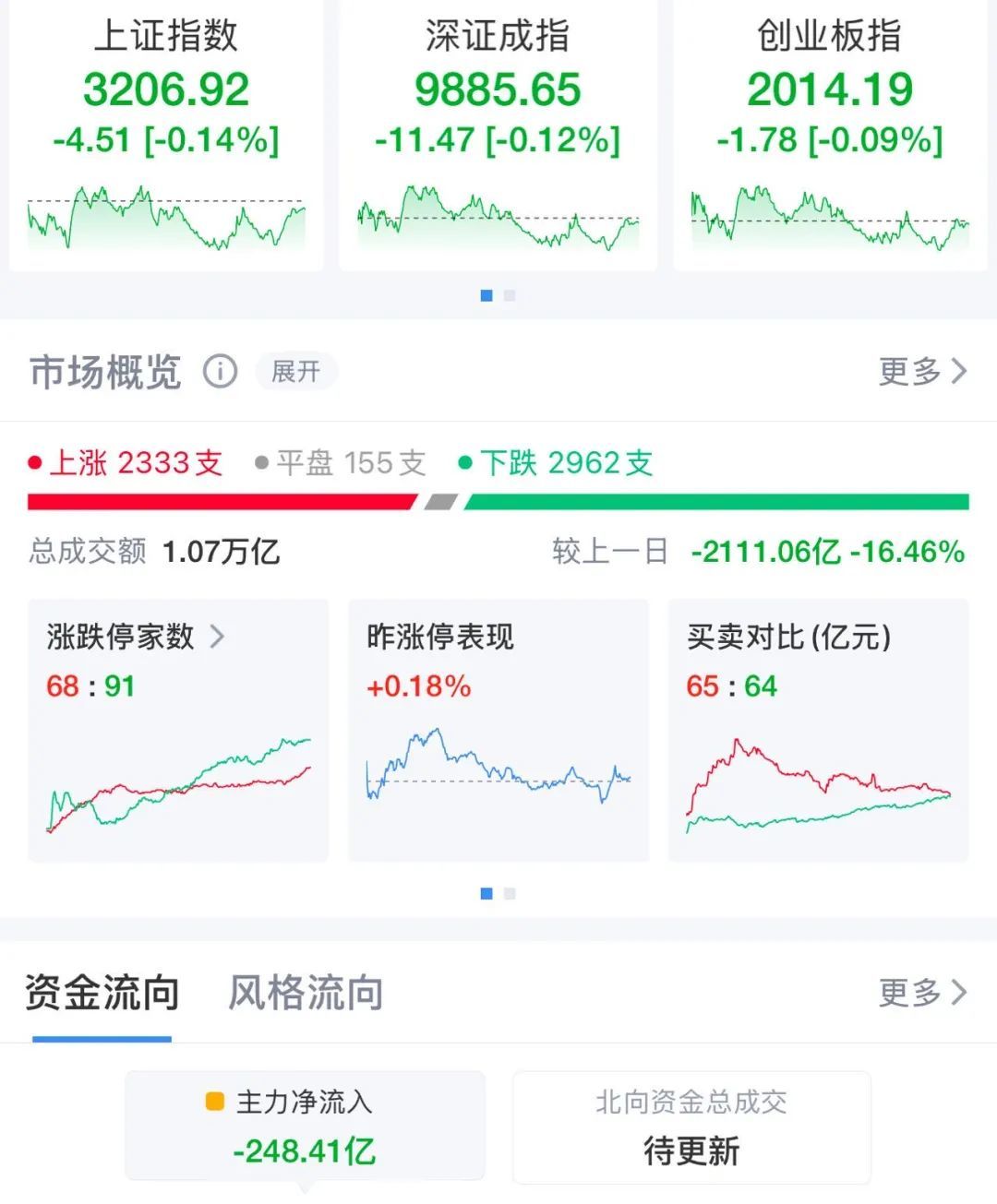 一月六日,市场全天疲软波动,三大指数均小幅下跌,上证指数盘中一度跌破3200点。截至收盘,上证指数已报3206.92点,下跌0.14%。;深成指下跌0.12%,报9885.65点。;创意报告2014.19点,跌幅为0.09%。总体而言,个股跌幅较大,跌幅超过2900只。