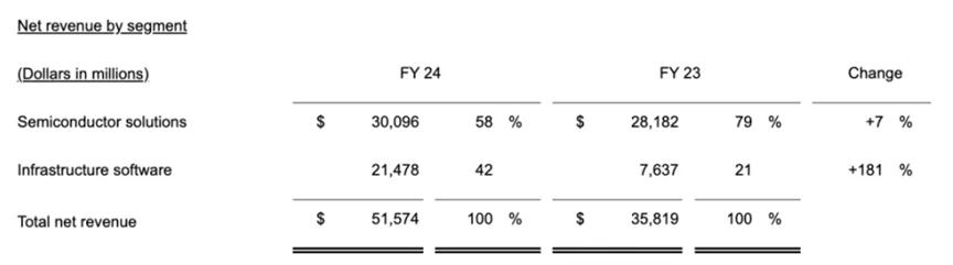但值得注意的是,根据业务情况,博通分为半导体解决方案业务基础设施软件业务,后者同比大幅增长196%,推动全年总收入大幅增长44%,这主要是由于VMware的并行,而原来的软件业务增速较小。