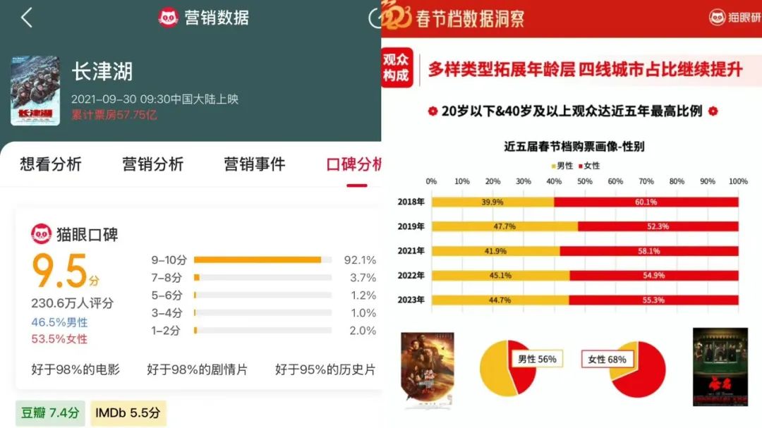 从猫眼数据来看,博纳的主旋律大片买票客户主要是男性,比如《红海行动》、《无与伦比》等。,所有这些都是更多的男性买票客户。然而,自从流量小生被引入以来,性别比例发生了逆转。由易烊千玺主演的《长津湖》系列和王一博主演的《无名》都是女性用户。