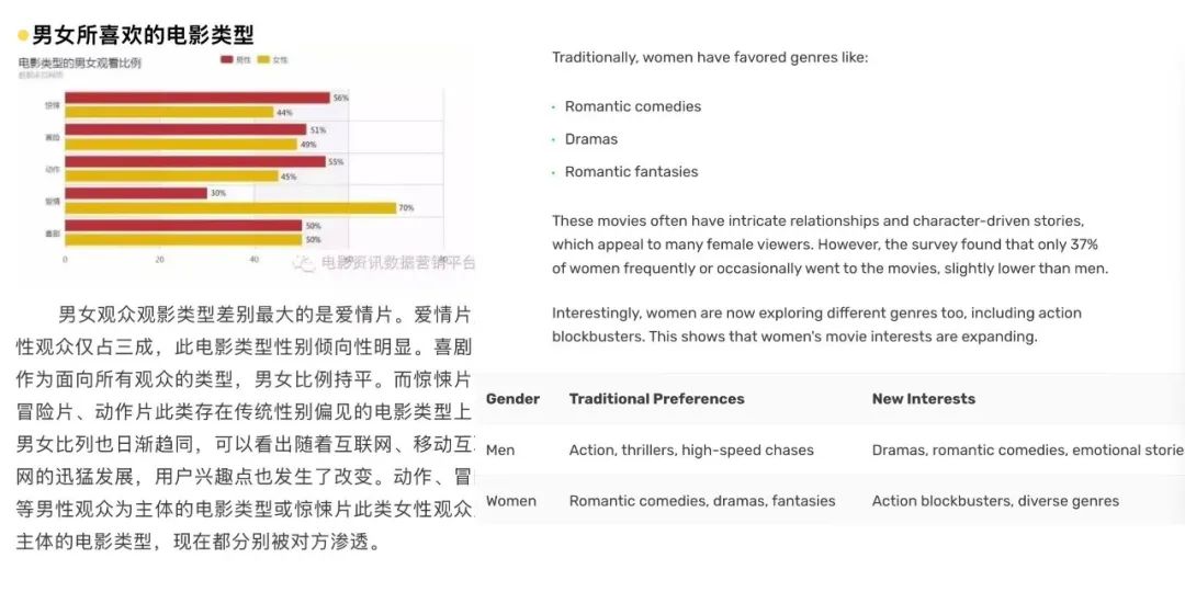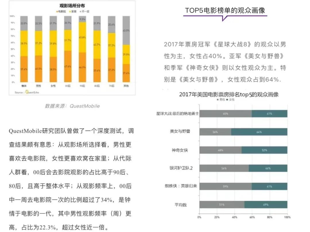 但是圈内人士普遍认为,在2017年之前,电影市场主要是男性观众。根据QuestMobile2017年的一项调查结果,男性比女性观众更喜欢去电影院看电影。而且男性每周看电影的频率比女性观众高近一倍。