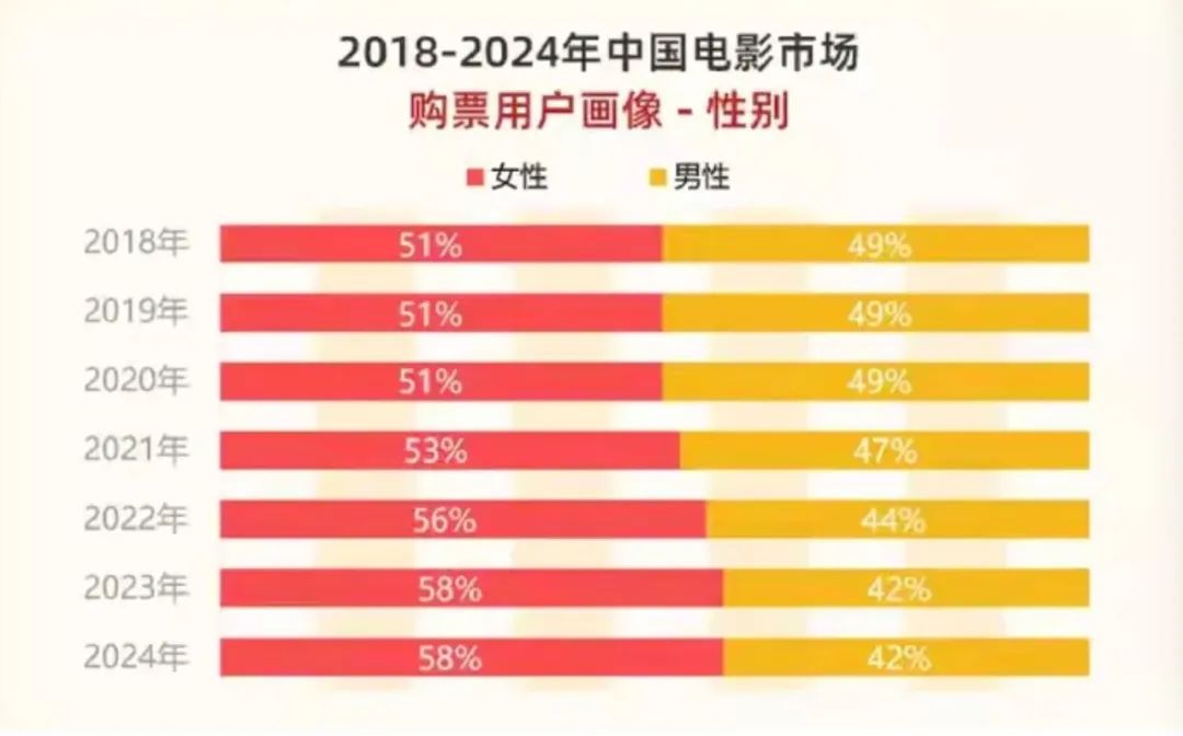 同期的猫眼暑期档和春节档报告也基本证实了这一变化。2017年之前,男女观众在电影市场的比例缺乏相关数据进行核实。
