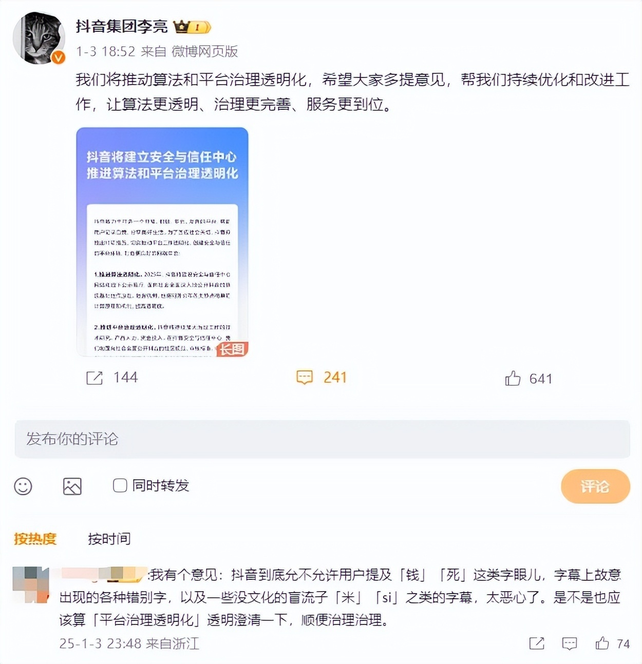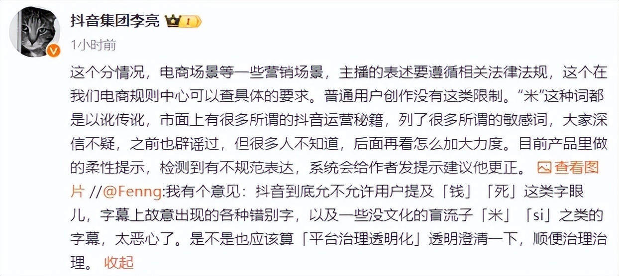 此前,有网友在李亮的博文下提出异议:“用户是否可以提到“钱”和“死”这两个字?字幕上故意出现的各种错别字都不舒服。是不是也应该算是‘平台治理透明’,澄清一下,顺便治理一下?”