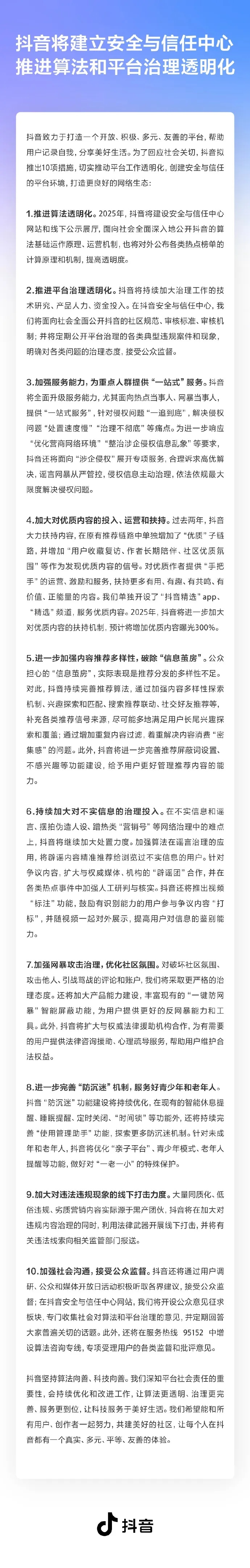 一月六日,抖音集团副总裁李亮在个人社交账号上发文称,抖音将推进算法和平台治理的透明度,并邀请网友提出意见。