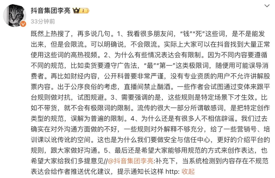 接着,@抖音集团李亮 再一次回应这件事,他说:“我看到很多朋友问‘钱’‘死’这几个字能不能发出来,但是会限制流量。可以明确的说,不会限制流量。事实上,我们可以在Tiktok上找到大量正常使用这些单词的热门视频。”