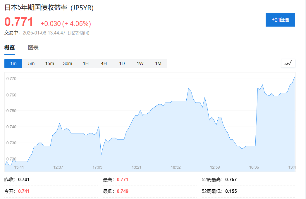 受植田和男演讲和美国长期国债利率上升的影响,日本国债利率大幅上升。其中,日本5年期国债收益率上升至0.77%,达到2009年至今的最高水平。日本10年期国债收益率也上升到2011年7月至今的高点。
