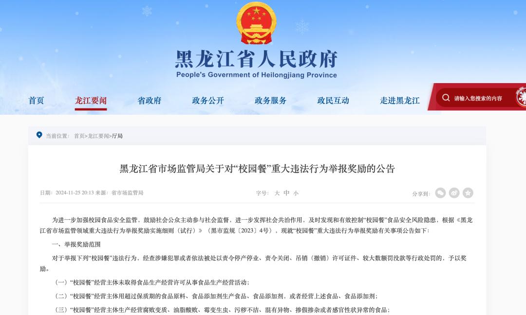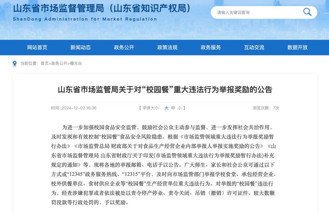 比如山东省市场监督管理局在其官网发布了《关于奖励“校园餐”重大违法行为的公告》,明确了报告渠道和奖励范围。