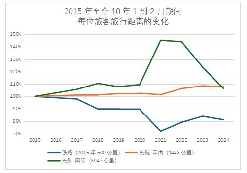 现在,与十年前相比,回家的压力已经明显减轻了许多。到2015年,每个铁路乘客平均要坐500公里的车;现在只有400公里了。而且民航乘客的距离比较长-15年是1443公里,现在是1556公里。