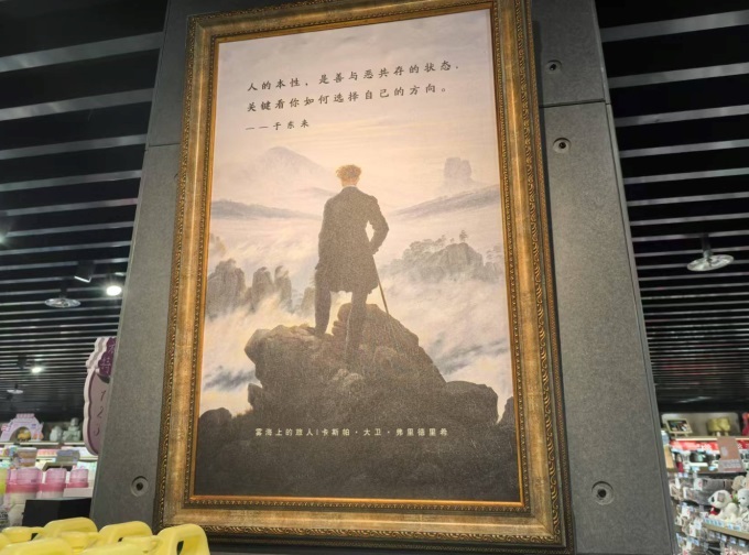 在店铺的整体环境和装修上,我们充分参考了胖东来的风格,创造性地引用了联商东来商业研究院在店铺装修中创作的“一句一句”的作品。东来哥的精彩语录与世界名画相结合,提升了店铺的艺术品味,凸显了美好理念和文化的传播。