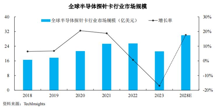 按Tech计算 根据Insights的数据,从2018年到2022年,全球半导体探针卡行业的市场规模从16.51亿美元增长到25.41亿美元。受半导体产业整体周期性波动的影响,2022年全球探针卡行业市场规模增速放缓,2023年规模缩小至21.09亿美元。