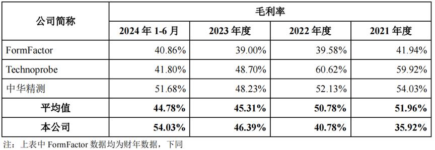 2023年、2024年1-6月,半导体毛利率高于同行业平均水平,主要是因为公司收入快速增长,MEMS探针卡收入比例增加。公司MEMS探针卡主要依靠自制探针,其技术附加值相对较高;与此同时,与2023年同行业相比,公司营业收入有一定程度的下降,对其毛利率产生了不利影响。