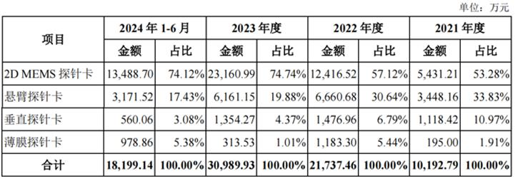 报告期内,按产品类型进行分类,2D MEMS探针卡是公司的主要收入来源。2024年1-6月,2D MEMS探针卡的销售收入占74.12%,悬臂探针卡、垂直探针卡、薄膜探针卡的利润占17.43%。、3.08%和5.38%。