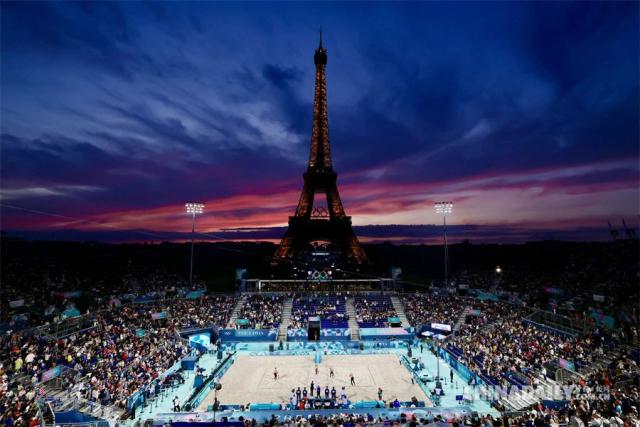 埃菲尔铁塔和沙滩排球比赛在夕阳下。|魏晓昊 / 中国日报