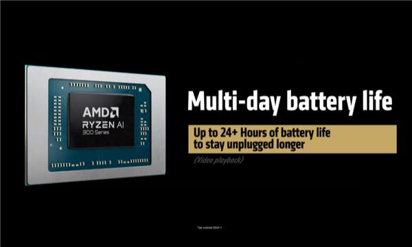 AMD 同时强调,锐龙 AI 7/5 300 这个系列能给笔记本带来最长的时间。 24 续航时间,这跟 Intel 的酷睿 Ultra 200V 这个系列有一拼,当然具体还要看型号和应用领域。