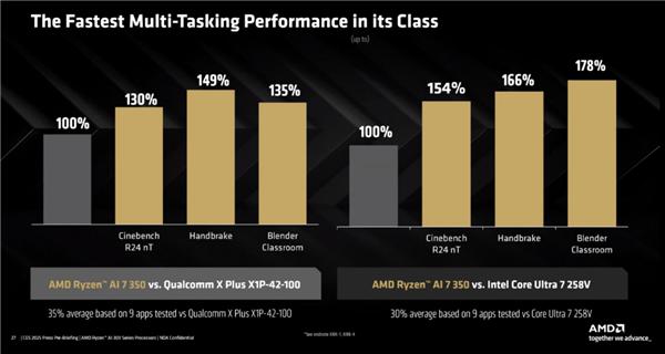 性能比较方面,AMD 先把高通骁龙放在一边 X Plus 8 核心版为拿出一把爆锤,同时将酷睿带出来。 Ultra 7 258V 又虐了一次,显得极其自信。