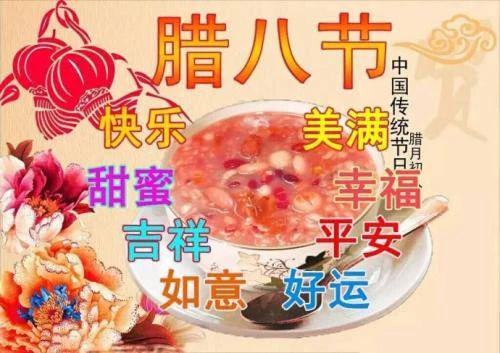 腊八节到了,我会给你一碗腊八粥,里面有幸福、快乐、健康、安全、吉祥、幸福、好运和甜蜜。愿你享受这八个祝福,迎接来自世界各地的好运,祝你事业有成,幸福快乐!