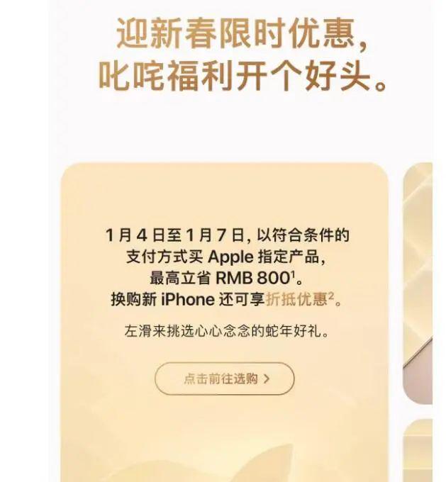 1 月 4 日本,苹果在官方微信和网页上宣布, 月 4 日到 7 每天,以符合条件的支付方式购买。 Apple 指定商品,最高立省 800 元,换购新 iPhone 还可以享受折扣优惠。这次苹果的降价几乎涵盖了所有的硬件类别,包括 iPhone、Mac、iPad、Apple Watch、AirPods 和 Apple Pencil。并且支持 12 免息期和以旧换新活动。
