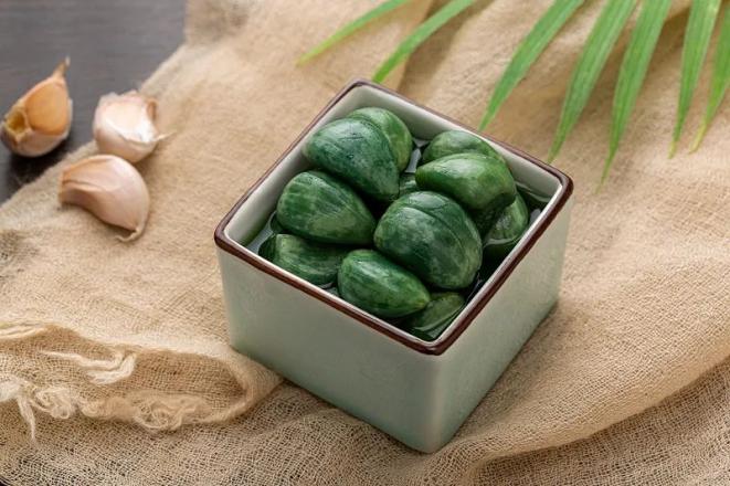 有些人喜欢浸泡腊八蒜。去皮的蒜瓣用醋浸泡在罐子里,密封在阴凉的地方。几天后,原本白色的蒜瓣变成了碧玉。浸泡过腊八蒜的醋也“荣幸”了,变成了腊八醋。