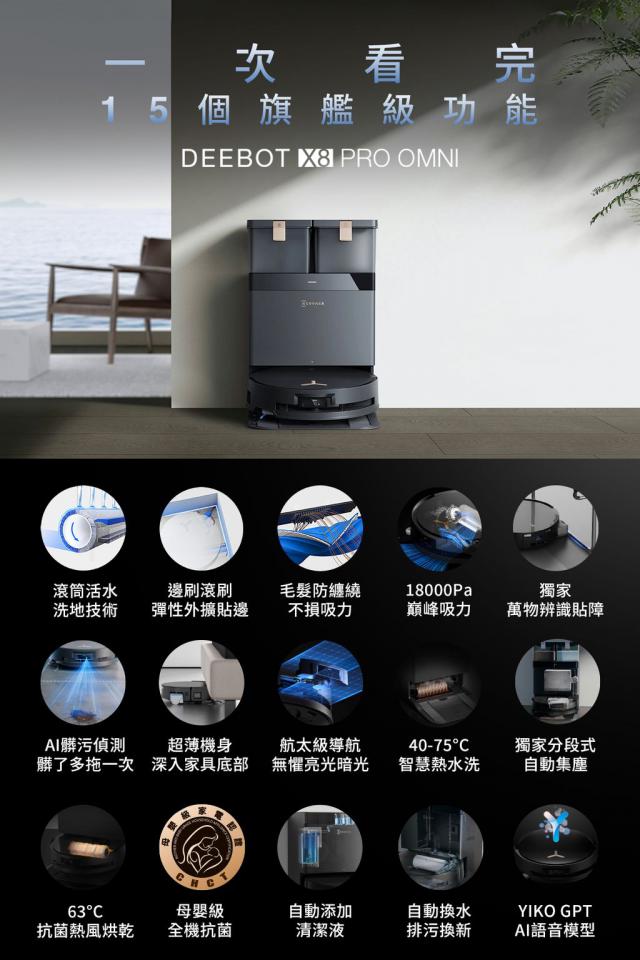 IT 家族援引新闻稿介绍,X8 PRO Omni 可搭配 Ecovacs Omni 站内使用,实现自动补水、清洗拖把、清除尘盒等功能,进一步解放双手。